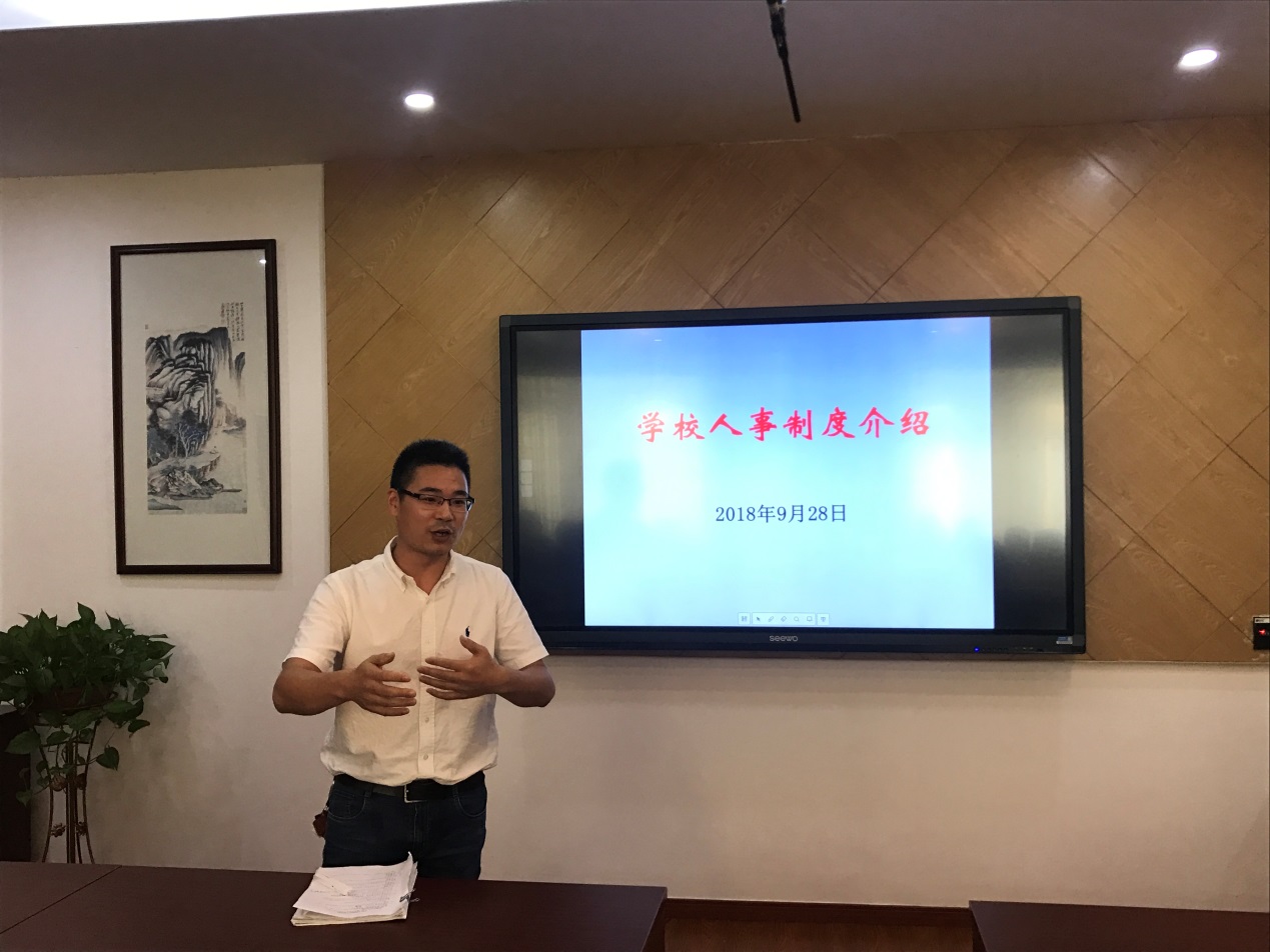 9月29日下午,人事处倪立宠副处长以“学校人事制度介绍”为主题,简单介绍了我校的收入结构,详细分析了职务晋升的资格条件和岗位晋级的层次,并阐述了相应的考核方式和进修培训规定。倪处长建议新任教师,讲座结束后应该再详细地阅读专业技术职务评聘、进修培训规定以及考核办法等相关人事制度。