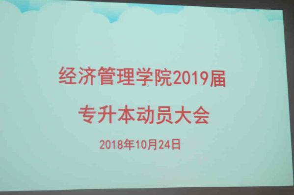 专升本是高职学生学历提升的重要通道,也是反映我校人才培养质量的重要指标之一。为丰富我院学子的就业选择,帮助其前往更好的下一站,为其将来发展搭建优质平台,10月24日下午,经济管理学院在阶东3-4教室召开2019届专升本动员大会,以帮助同学们以更积极的状态,更坚定的信念参加专升本考试。参加此次动员会的有经济管理学院党总支副书记覃龙飞、辅导员,以及2019届160余名大三学生。