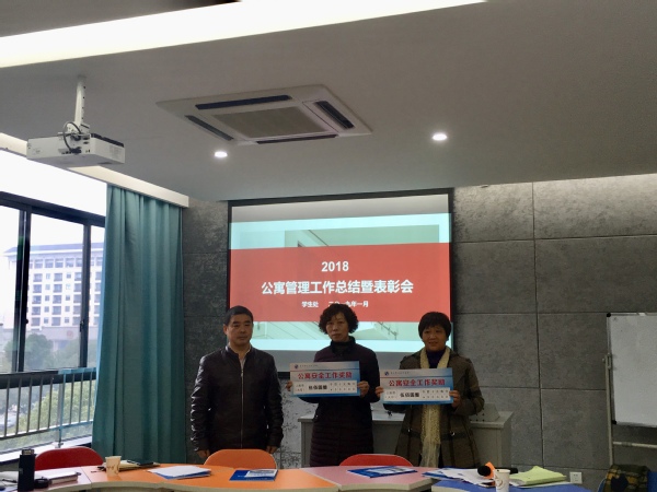 会上对获得2018年公寓安全工作特别奖励的两名值班员——裴金莲、王美娟进行了通报奖励,并表彰了本学期的模范寝室。