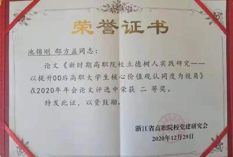 此外,马克思主义学院教师池锦刚等人撰写的《新时期高职院校立德树人实践研究——以提升00后高职大学生核心价值观认同度为视角》获得二等奖。