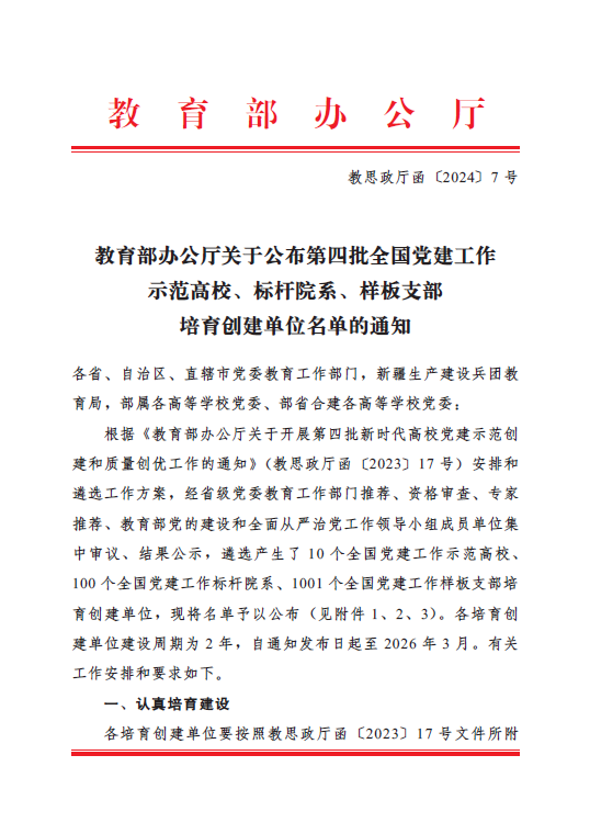 近日,教育部办公厅公布第四批全国党建工作示范高校、标杆院系、样板支部培育创建单位名单,医学院第二党支部成为我校首个全国党建工作样板支部培育创建单位,学校党建示范创建和质量创优工作取得新突破。
