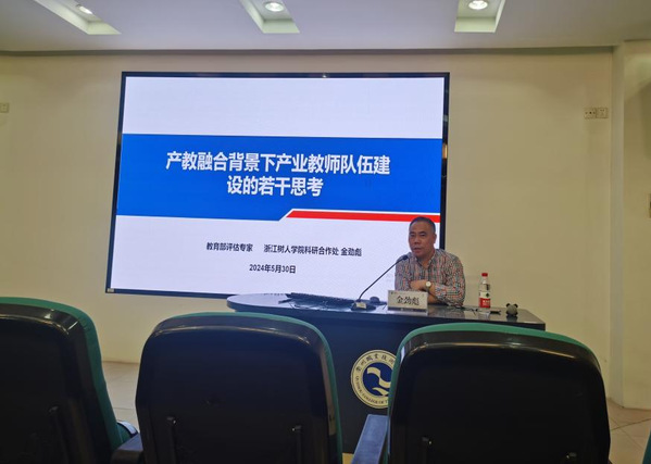 5月30日下午,我校邀请浙江树人学院科研合作处处长金劲彪作“产教融合背景下产业教师队伍建设的若干思考”主题讲座。
