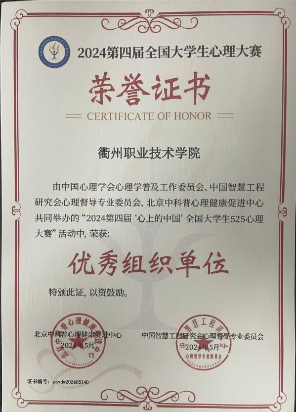 2024年5月31日,为期一个月的“2024第四届‘心上的中国’全国大学生525心理大赛”圆满结束。我校师生团队在活动中,取得了显著成绩,充分展现了我校学子在心理健康领域的专业素养和综合实力。