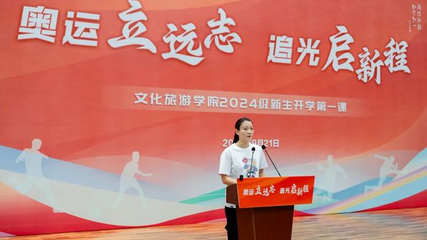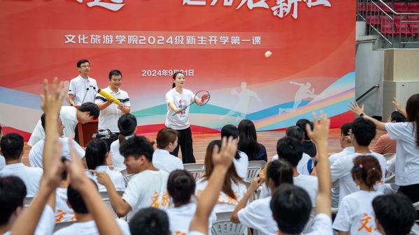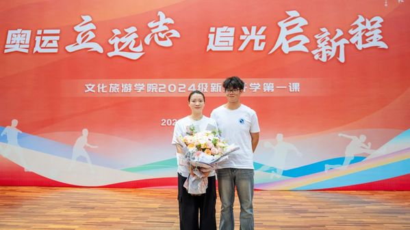 921日上午,衢职院文化旅游学院举行了2024级新生开学第一课活动。为弘扬奥运精神,激励新文旅人立下远大志向、追求卓越未来,学院特别邀请巴黎奥运会羽毛球混双冠军、衢州市城市形象大使、我校校外指导教师黄雅琼来到现场。学院院长郭大勇、党总支书记李威、副院长彭晓倩及学院全体教职工参加。本次开学第一课以“奥运立远志,追光启新程”为主题,现场氛围热烈,同学们反响积极。