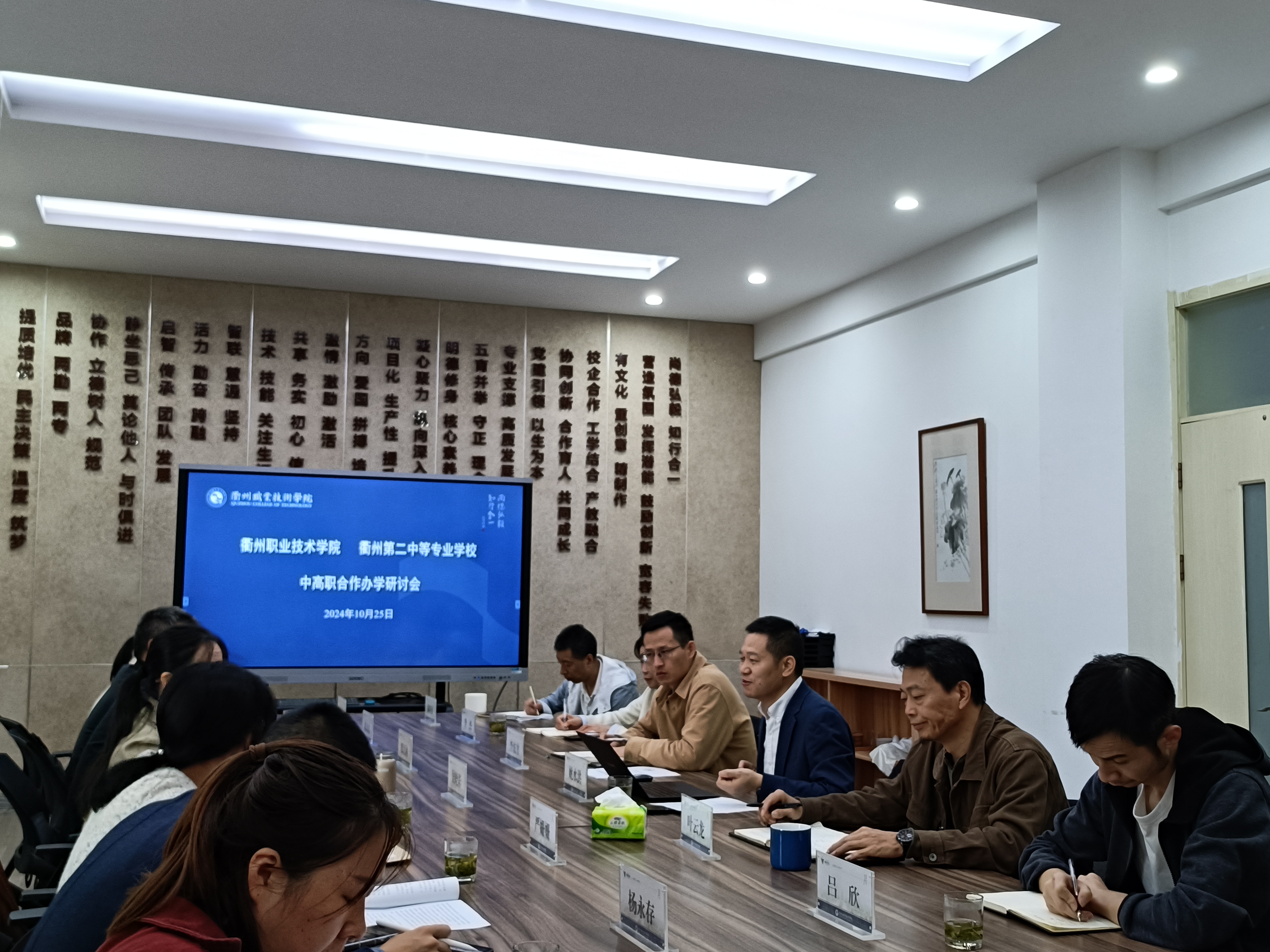 10月25日,衢州第二中专校长吴晓彩一行来校就两校中高职一体化合作工作进行交流座谈。学校党委委员、副校长姚水洪主持会议,两校相关部门负责人参加。