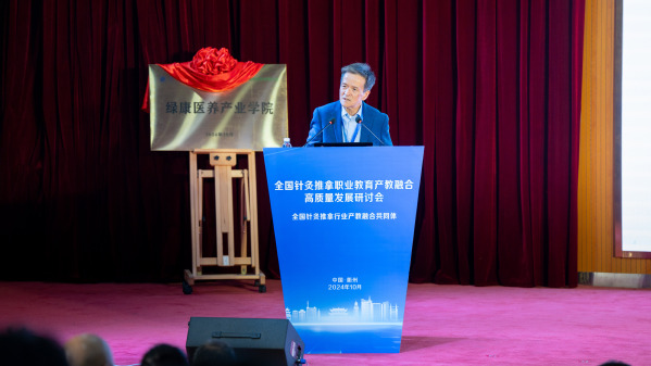 喻晓春致辞。他表示,中国针灸学会将全力搭建学术交流,科学研究,人才智库“三驾马车”,高质量推动共同体构建体系更全、质量更高、贡献更大的现代职业教育体系,助力打造中医药康养产业产教融合发展全国典范。