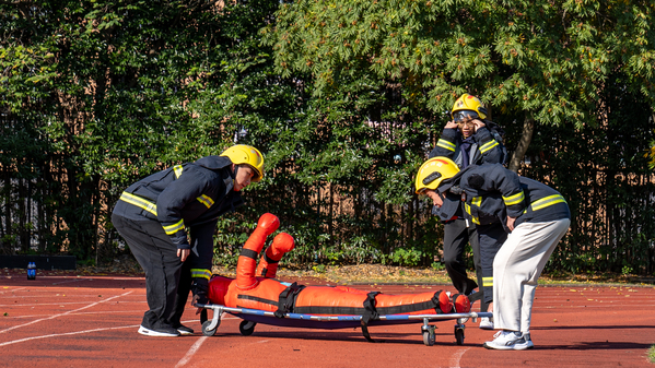 本次运动会设置了消防战斗服原地着装、灭火接力、火场逃生、抬送120斤假人“伤员”等消防技能比赛项目。同学们在实际操作中学习如何正确使用灭火器、快速连接水带以及掌握逃生技巧。这些项目不仅考验了同学们的体能和反应速度,更重要的是让他们在轻松愉快的氛围中掌握了关键的消防技能。
