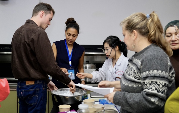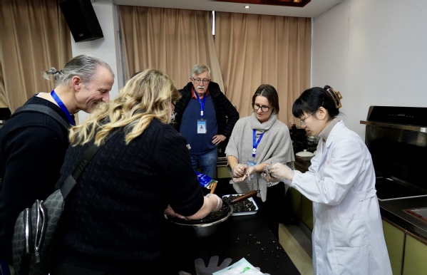 在衢州市人民医院中药房,中药师向留学生们介绍了每种药材的产地、功效和用药禁忌,中药材的分类、储存和炮制方法。留学生们亲手称量药材、研磨粉末,体验了中药制备的全过程,通过有趣药膳制作,对中药材有了更深入的了解。